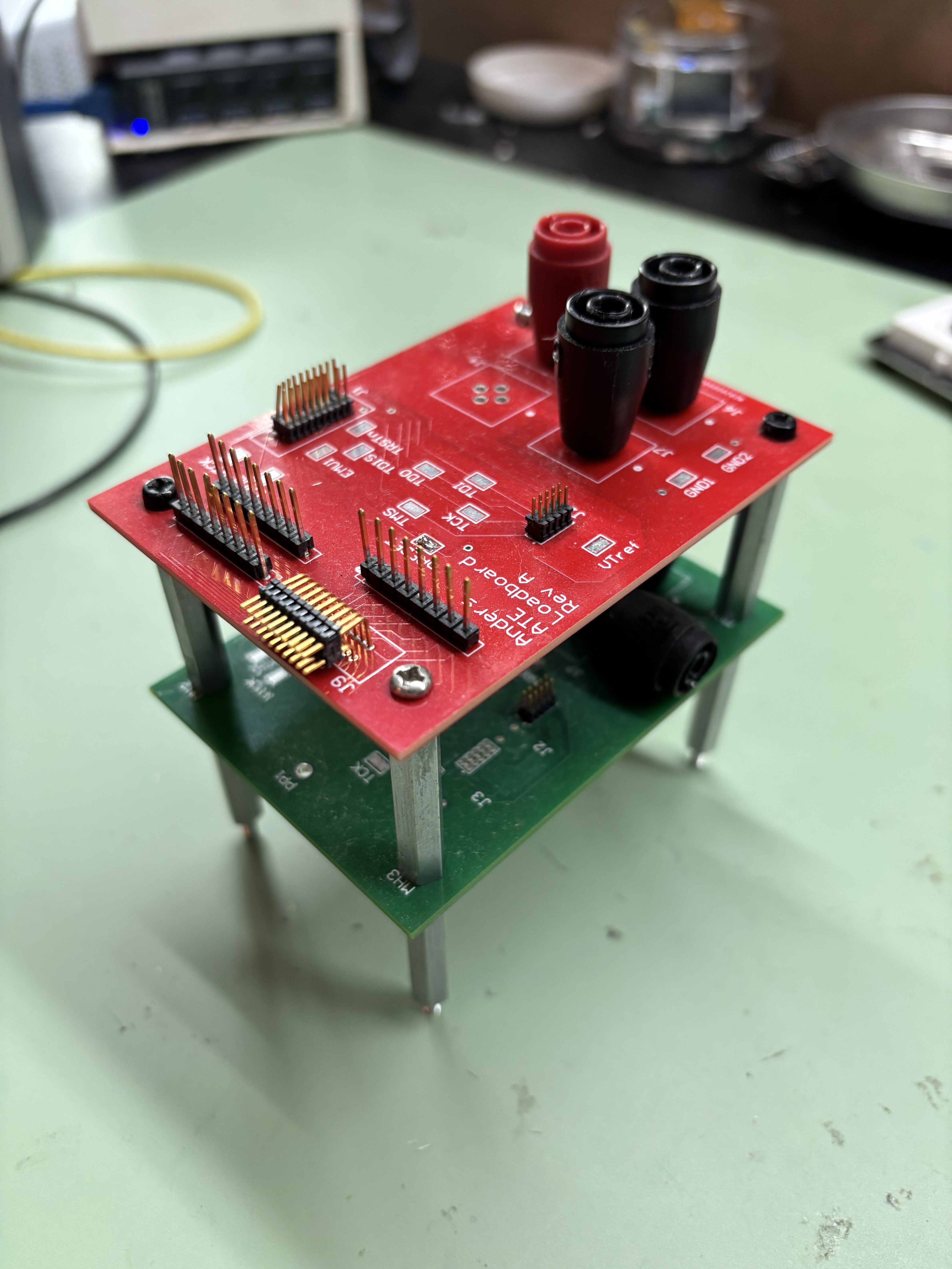The board works as expected! I'm really pleased with how this turned out. I also love the look with the green test PCB, the yellow probe board, and the red breakout board. The only minor annoyance is having to redo the standoff screws each time I swap boards. But there’s always something to improve, possibly I can move to a clamping solution or something.